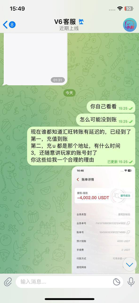 这逼台子见我一个月没来昨天充值4000U准备去玩玩结果汇旺提现有延迟最后到账了说我一直没有到账