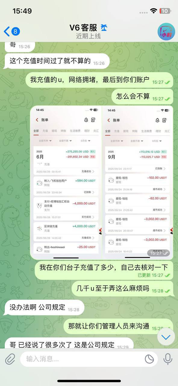我提供了账单和他们充值到账的哈希,我让管理部门来沟通,代理的平台客服直接说我充值时间过了又说充值无效,到最后直接让我登不上号了,登录账号无效。